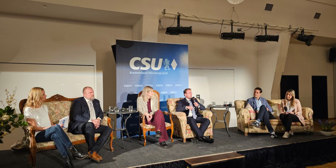 Mit rund 150 Gästen war das Röttinger Kanapee-Gespräch der CSU Würzburg-Land in der Burghalle wieder sehr gut besucht. Neben vielen Bürgerinnen und Bürgern kam auch eine ganze Reihe von Mandatsträgern aus der kommunalen Familie, wie Bezirkstagspräsident Stefan Funk in die Europastadt. Die Veranstaltung bot zu Beginn des neuen Jahres einen intensiven Austausch zu kommunalpolitischen Themen sowie zur Arbeit des Bürgerbeauftragten der Bayerischen Staatsregierung, Wolfgang Fackler. Dieses Amt übt der 50-jährige Landtagsabgeordnete (CSU) aus dem Stimmkreis Donau-Ries seit November 2023 aus. Auf dem Podium diskutierten zudem Theilheims 1. Bürgermeisterin Karoline Ruf, Landrat Thomas Eberth und Landtagsabgeordneter Björn Jungbauer (CSU). Moderiert wurde der Abend von Christiane Blasczyk und Kreisrätin Marion Schmieg.